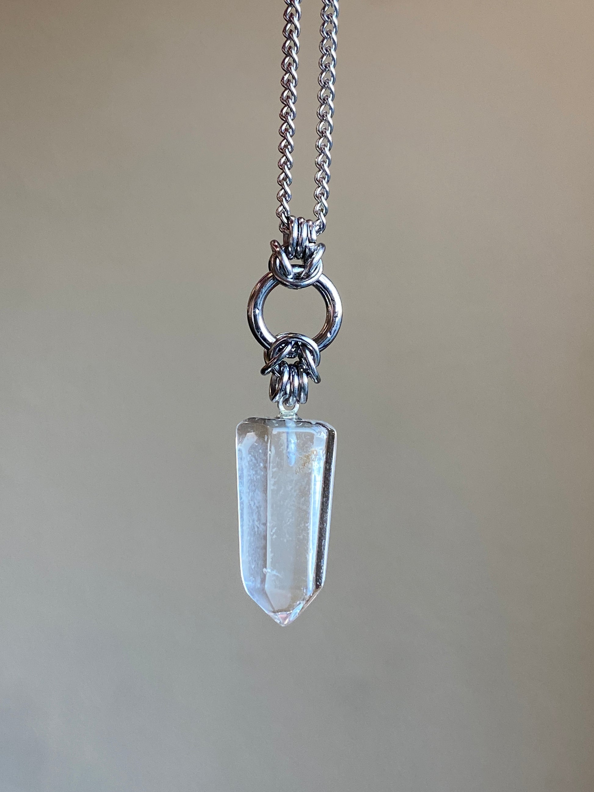 Crafted with precision, this necklace features a skillfully woven stainless steel chain mail intertwined with a polished, faceted quartz, creating a strikingly bold yet elegant statement piece.