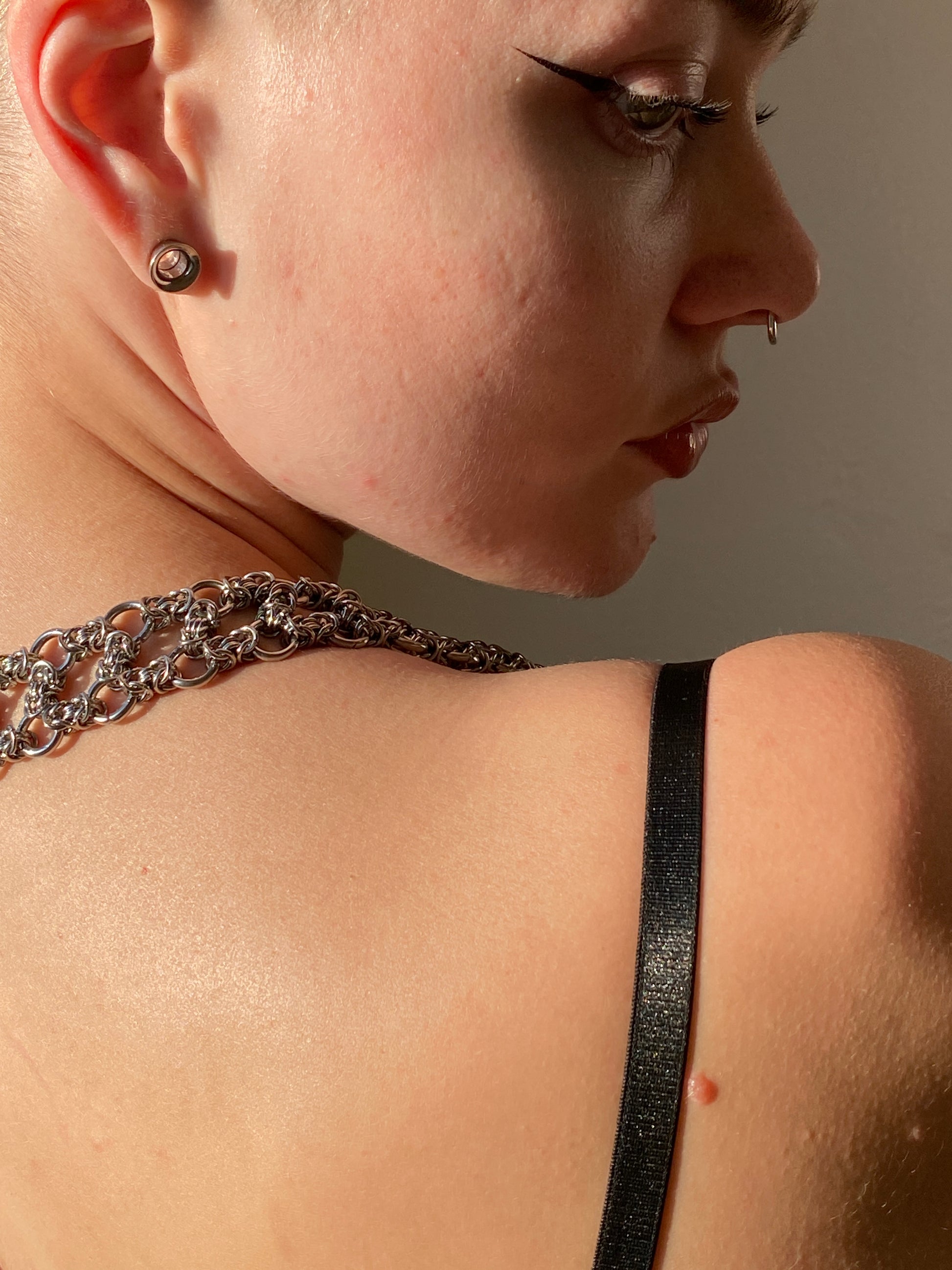 This bodychain is meant to make the wearer feel like an absolute badass. It can be worn over or under clothing, or with no clothing.